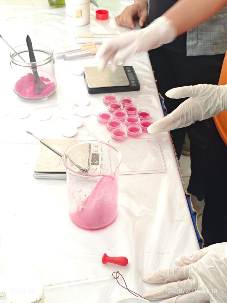 Fokus utama pelatihan ini adalah teknik formulasi lip balm dan lip gloss dengan menggunakan bahan dasar minyak kelapa murni (Virgin Coconut Oil). Pemilihan minyak kelapa didasarkan pada kemampuannya yang luar biasa dalam menjaga kelembapan bibir serta ketersediaannya yang melimpah di wilayah Sulawesi Selatan. Selain itu, inovasi yang ditonjolkan adalah penggunaan limbah kulit buah naga sebagai pewarna alami. Kulit buah naga mengandung pigmen antosianin yang tidak hanya memberikan warna merah keunguan yang cantik, tetapi juga berfungsi sebagai antioksidan untuk melindungi bibir dari radikal bebas.